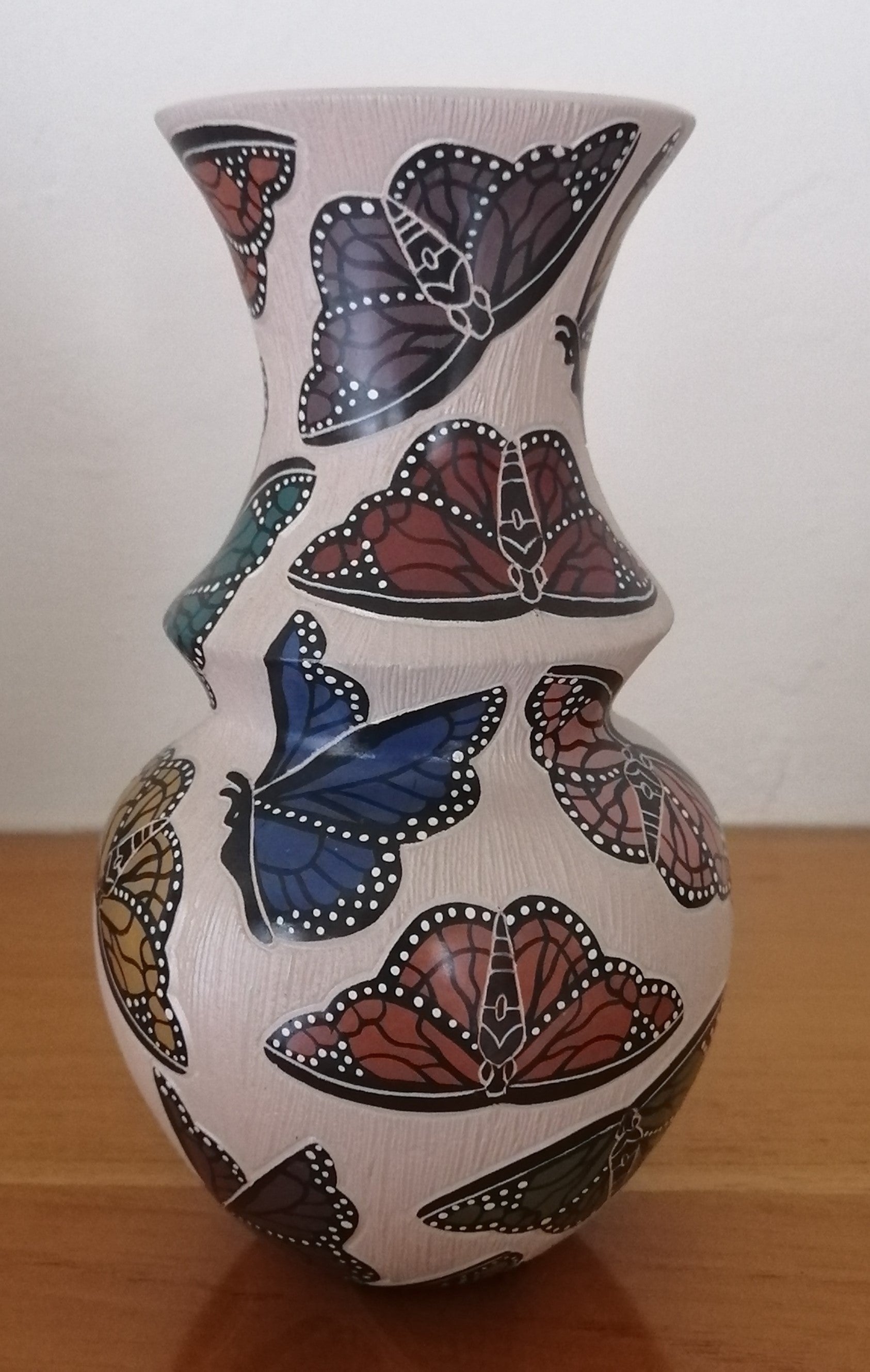 Elegant shape of a piece of ceramic with multicolor butterflies