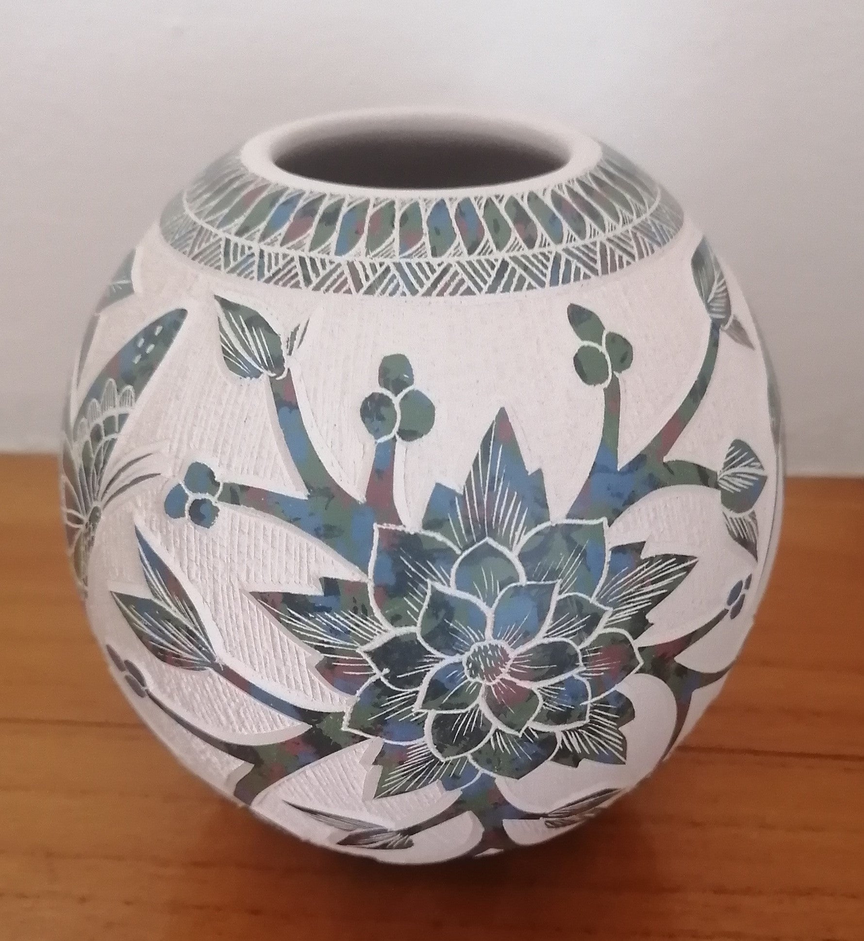 When Lupita got married she learned from her husband Hector Quintana to carve her pieces drawing amazing nature designs in soft and delicate colors.