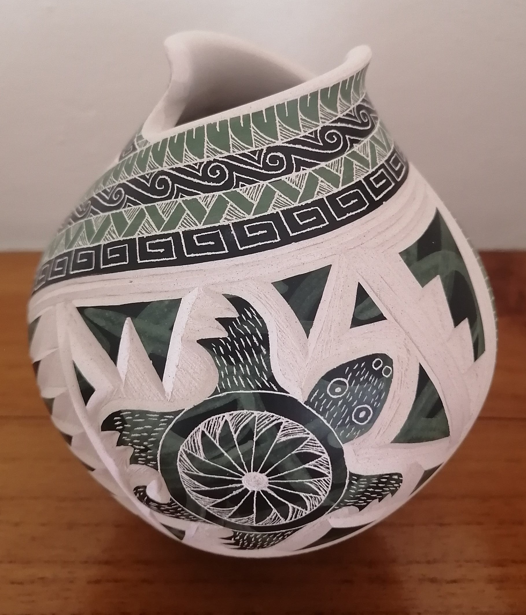Martin and his two brothers Eduardo and Jesus are known for their white or red clay pieces carved in an expert way. He does deeper carving than his brothers. The pot is usually formed on an egg shape or vase with a mouth. He also carves animals usually birds or reptiles with a lot of care on the surface of the pots.